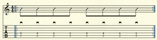 Quando o seu dedo anelar estiver a tocar a casa 4, mantenha o seu dedo indicativo apertando a casa 2.Ouça o áudio em baixo, no caso está a ser utilizado o palm muting, uma técnica que veremos mais à frente, que consiste em encostar a lateral da sua mão direita na ponte da guitarra.