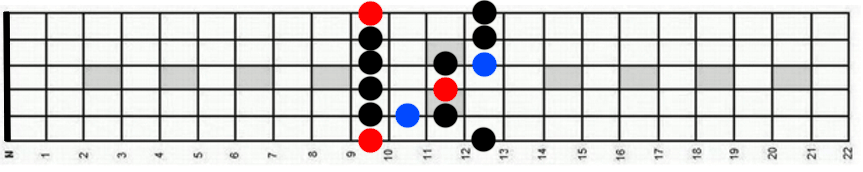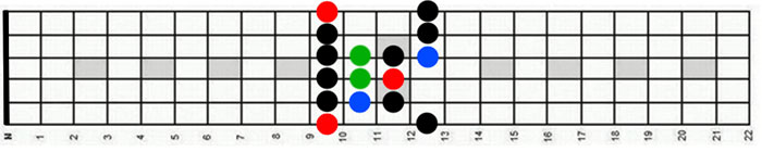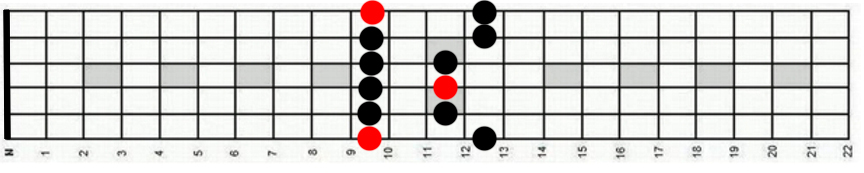 A vermelho temos a tónica. A nota tónica indica qual a escala. Se começar a tocar a partir da quinta casa da guitarra, nota Lá, então está a tocar a escala pentatónica menor de Lá.