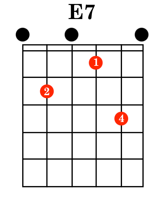 A versão mais básica deste acorde é um Mi maior sem o dedo 3. Contudo, podemos adicionar o quarto dedo para dar ao acorde uma intenção dominante maior.